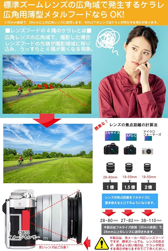 レンズフィルター装着が原因で、4隅のケラレが発生した場合、メタルフード 前面部にレンズフィルターを装着できることで、レンズフィルター装着のための4隅のケラレを軽減することができます。