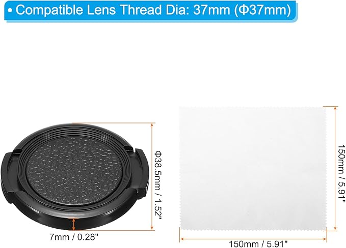 仕様:素材:プラスチック;カラー:黒;対応レンズスレッド直径:37mm (Φ37mm);レンズキャップ全体サイズ:7 x 38.5mm/0.28 x 1.52"(H*外径);クロスサイズ:150x150mm/5.91x5.91"(縦x横);パッキングリスト:レンズキャップ5個、マイクロファイバークリーニングクロス5枚