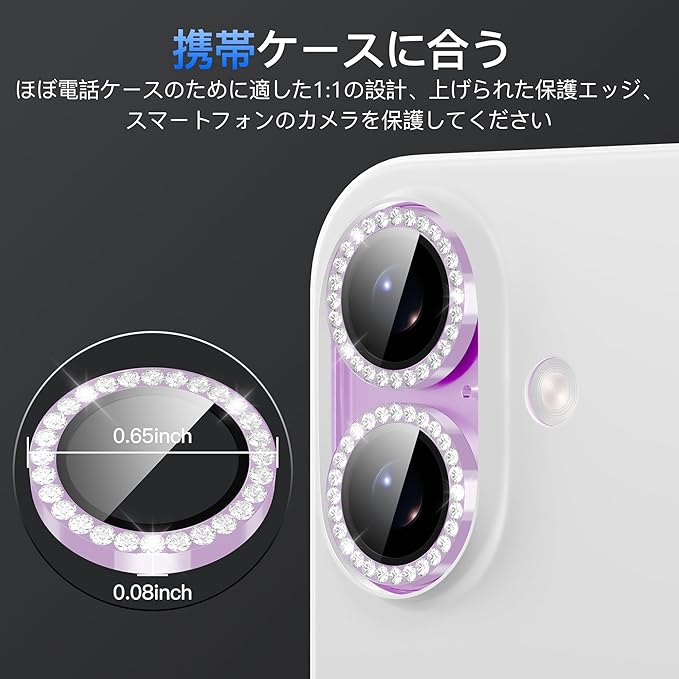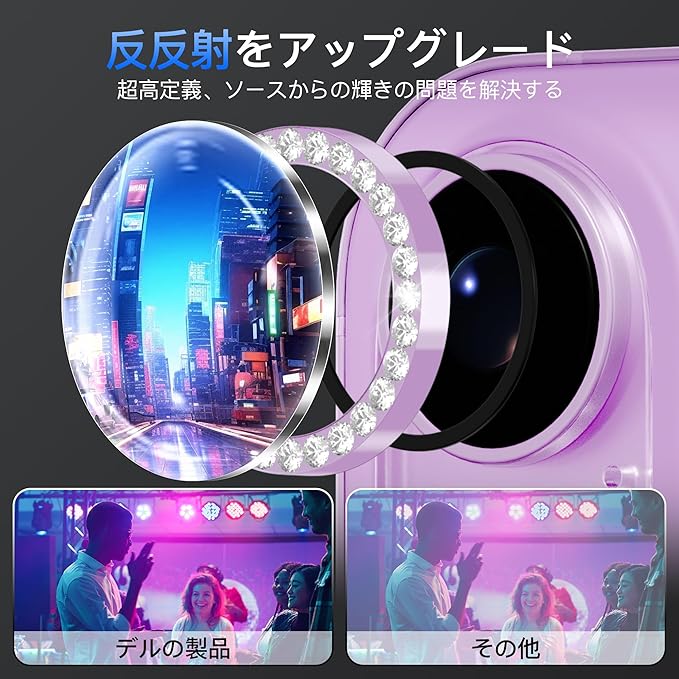 製品の特徴:For iPhone 17カメラレンズ保護カバー。ベゼルに光を屈折させるダイヤモンドをあしらい、光のある環境でキラキラと輝きます。レンズ部には9H強化ガラス膜を採用し、エッジのブラックコーティングにより雑光や派手な光がレンズに入るのを防ぎ、露出を抑えています