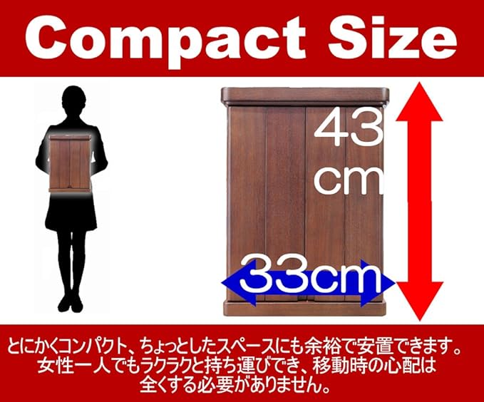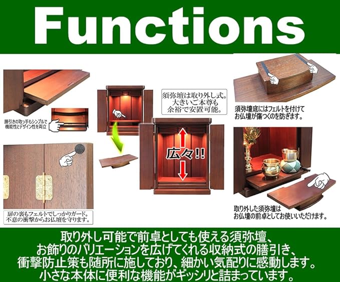 【便利な機能も充実】また、お道具のお飾りに欠かせない膳引きも完備。仏具のお飾りやお供えの際に生まれる余裕がお参りをより快適にします。そしてご本尊を安置する須弥段は取り外し可能で大きい仏像の安置も可能に。お飾りの幅を広げてくれます。取り外した須弥壇は前卓として、お供えの安置などにお使いいただけます。コンパクト仏壇では犠牲にされがちな収納面にもしっかり配慮。デザイン性と実用性を両立しています。細かいところまでこだわりまくって作り上げられたお仏壇です。 総高43.4cmX幅32.6cmX奥24.2cm 扉開時幅 45cm(写真のように扉を開いたときの幅です。扉の開き方によって、40cm~設置可能です)