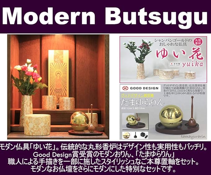 【モダン仏具セット「ゆいか」】陶器に華やかな花柄デザイン、シャンパンゴールドのカラーリングでお仏壇の雰囲気がガラリと変わります。どなたでも安心して使える丸香炉でスタイリッシュに、エコにお参りいただけます。 【Good Design賞受賞の「たまゆらりん」】たたくと澄んだ音を奏でながらゆらゆらと可愛く揺れる大人気のモダンおりん、たまゆらりん。丸みと揺らぎが極上の癒しをお約束します。
