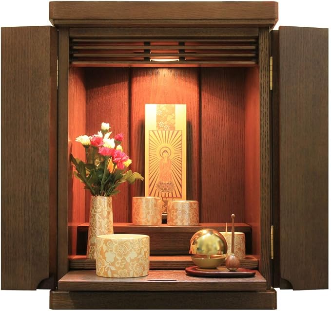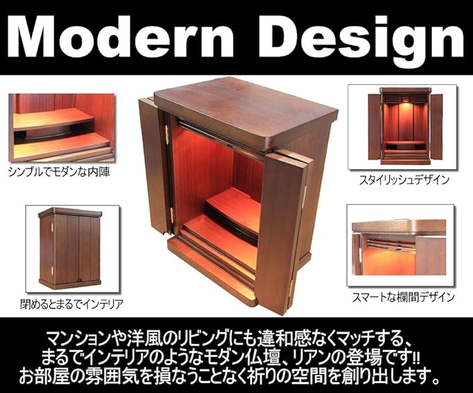 【超コンパクトボディにモダンデザイン。ミニ仏壇の決定版です!!】女性でもラクラクに運べるサイズとスタイリッシュなインテリアデザイン。ミニ仏壇に求めるものがすべて詰まったミニ仏壇リアン。ちょっとした隙間やタンスの上、あるいは介護施設でも余裕で置ける14号サイズ。シックなウォールナット色にモダンなデザインはリビングのインテリアとも違和感なくマッチ。 家族みんながすごす場所にお仏壇を置けるため、自然とお参りしていただけます。ミニ仏壇リアンで、お仏壇のある生活を始めてみませんか?