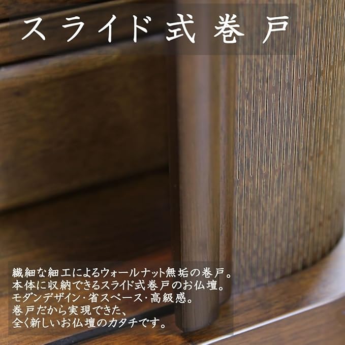【スライド式巻戸】繊細な細工によるウォールナット無垢の巻戸。本体に収納できるスライド式巻戸のお仏壇。モダンデザイン・省スペース・高級感。巻戸だから実現できた、全く新しいお仏壇のカタチです。
