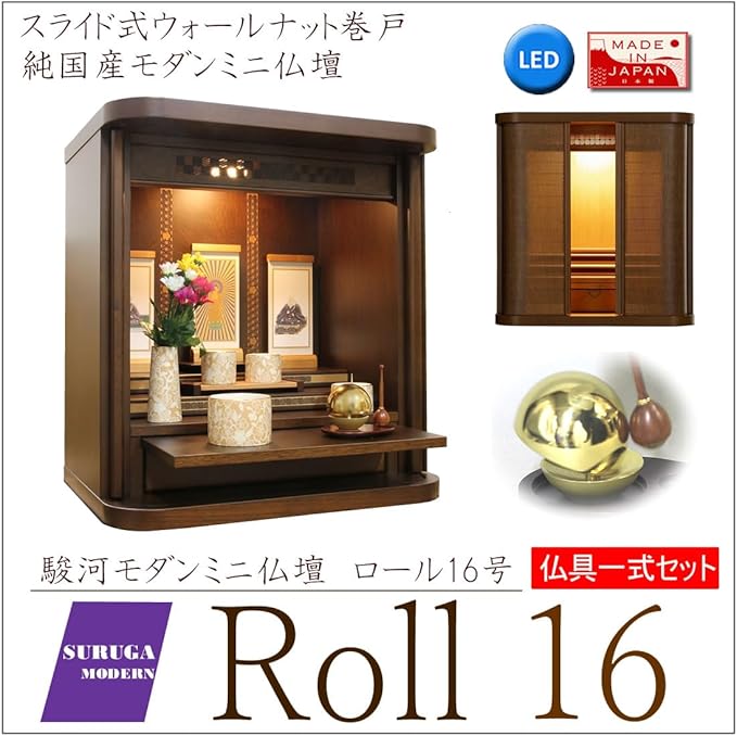 松山神仏具店 ミニ仏壇 モダン仏壇 ロール16号 おしゃれ 巻戸 まきど ウォールナット 日本製 国産 LEDライト 高48cm 幅44cm 奥33cm 全宗派対応 モダン仏具ゆい花(丸香炉) たまゆらりん 仏具一式セット 浄土宗