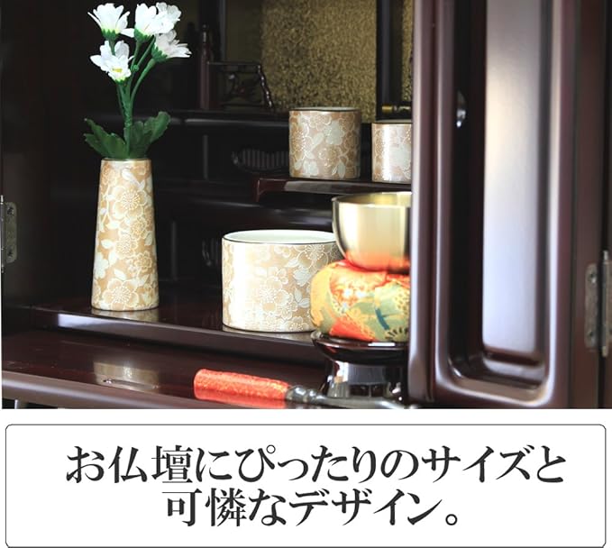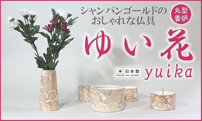 【モダン仏具セット「ゆいか」】陶器に華やかな花柄デザイン、シャンパンゴールドのカラーリングでお仏壇の雰囲気がガラリと変わります。伝統的で使いやすい丸型香炉でどなたでも安心してお使いいただけます。