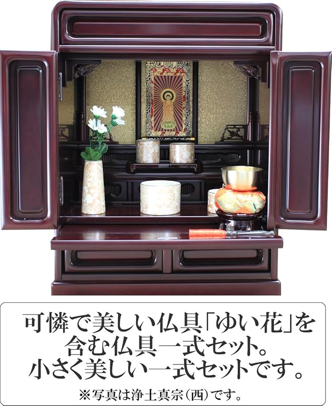 松山神仏具店 上置ミニ仏壇16号 高49.5cm 幅39cm 奥25cm モダン仏具ゆい花 (丸香炉) 一式セット 日蓮宗
