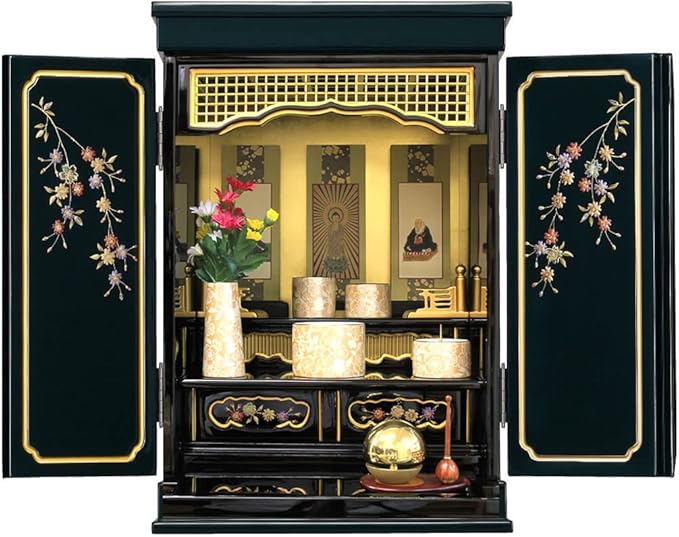 【お仏壇のサイズ】高50.5cmX幅34cmX奥30cm 扉開時幅 60cm(写真のように扉を開いたときの幅です。扉の開き方によって、55cm~設置可能です)
