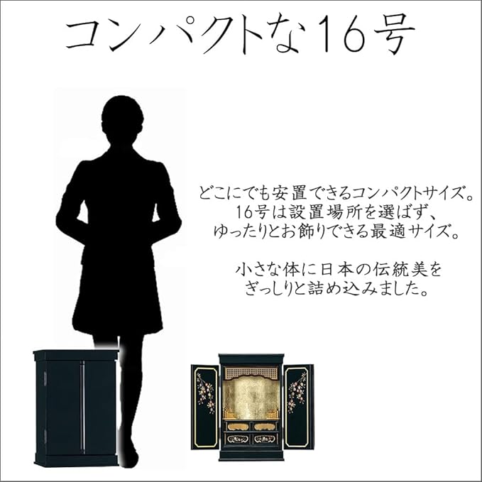 【コンパクトな16号】どこにでも安置できるコンパクトサイズ。16号は設置場所を選ばず、ゆったりとお飾りできる最適サイズ。小さな体に日本の伝統美をぎっしりと詰め込みました。