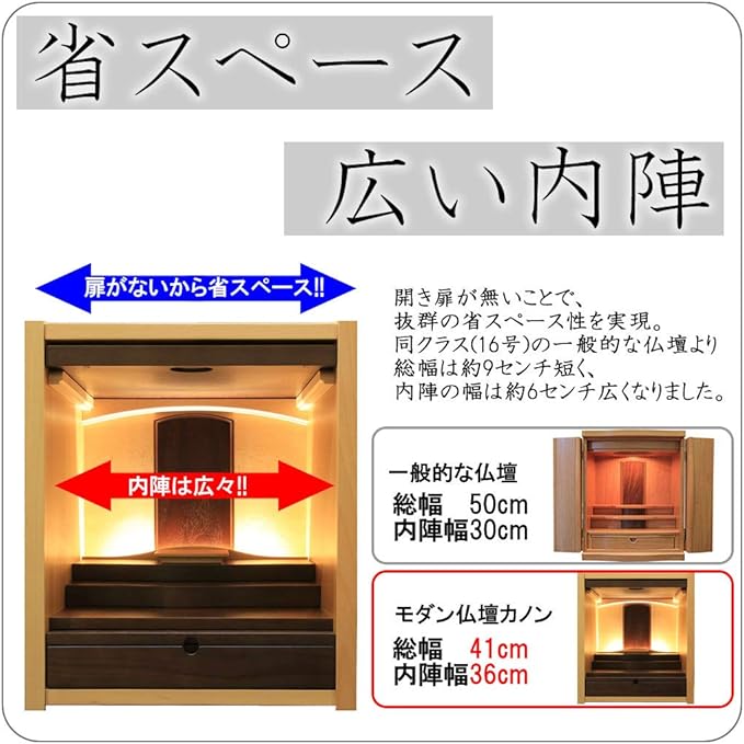 【省スペースで広い内陣】開き扉が無いことで、抜群の省スペース性を実現。同クラス(16号)の一般的な仏壇より総幅は約9センチ短く、内陣の幅は約6センチ広くなりました。