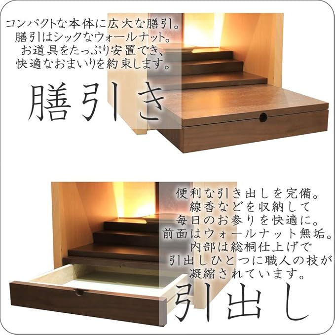 【市松模様と桜】伝統とモダンが融合した扉デザイン。ウォールナットとブナのツートンカラーを大胆な市松模様に。桜の花びらの彫刻が華やかに彩ります。【ウォールナットとブナ】重厚で高級感溢れるウォールナットと、明るいブナ。人気の二種の天然木が織りなすシャープなデザイン。木のぬくもりとデザイナーのこだわりを感じる、本格的なモダンミニ仏壇です。【膳引きと引出し】コンパクトな本体に広大な膳引。膳引はシックなウォールナット。お道具をたっぷり安置でき、快適なおまいりを約束します。便利な引き出しも完備。線香などを収納して毎日のお参りを快適に。前面はウォールナット無垢。内部は総桐仕上げで引出しひとつに職人の技が凝縮されています。【取り外し式内陣】内陣壇は取り外しが可能。取り外すと大きなご本尊にも対応可能でお飾りの幅がぐんと広がります。外した須弥壇は前卓としてお供えものや仏具の安置にお使いいただけます。