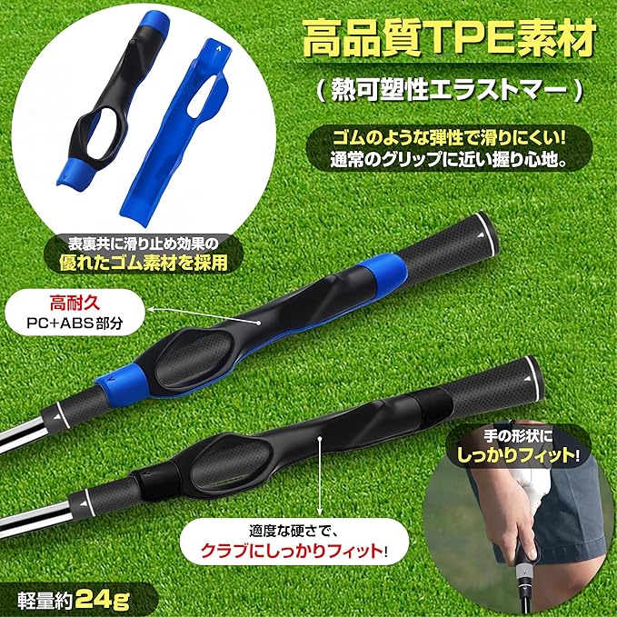 ✅【高品質TPE素材、高耐久PC+ABS素材】 手に触れる部分には、ゴムのような弾性を持つ高品質TPE素材(熱可塑性エラストマー)を採用。通常のグリップに近い感覚で握れるため、違和感なくトレーニングに集中できます。表裏に施された滑り止め加工により、余計な力を入れずにスイングでき、手や腕への負担軽減にも繋がります。