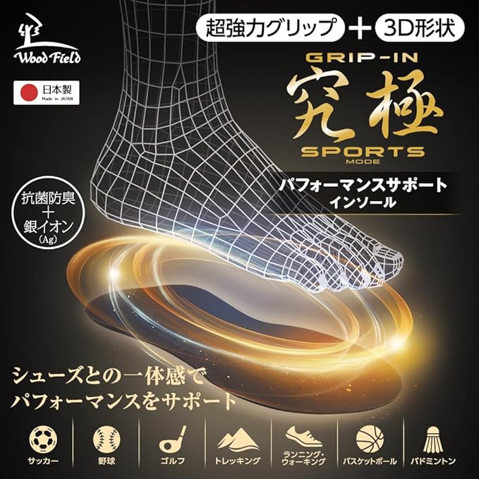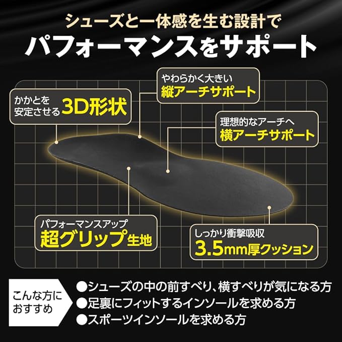 スポーツ 滑らない 超強力グリップ 前滑り 横滑り防止 高耐久性 高吸湿性 抗菌防臭性 パフォーマンスサポート 究極インソール