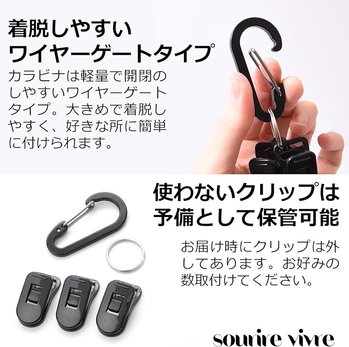 【着脱しやすいカラビナ&予備クリップ付き】軽量なワイヤーゲートタイプのカラビナで、キャディバッグやズボンのベルトへの引っ掛けも簡単。クリップは合計3個付属するため、用途を分けたり破損時の予備として保管しておくことも可能です。