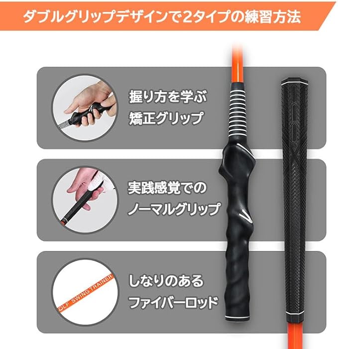 【ダブルグリップデザイン】 矯正グリップで握り方をマスターし、ノーマルグリップで実践感覚を確認できる2タイプのグリップを搭載。