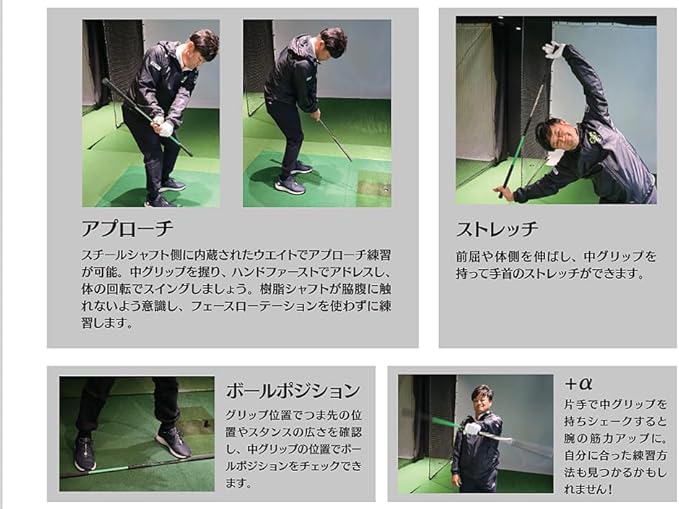 シャフトのしなりを活かしてスイングを安定させ、方向性や飛距離を向上。速いスイングやアプローチの間隔を養い、適切なボールポジションも確認できます。ストレッチや筋力アップにも活用でき、自分に合った練習方法が見つかるかもしれません。