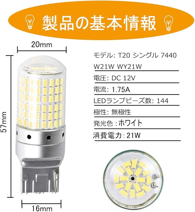 【最新型のデザイン】 純正T20サイズ箇所で利用した144LEDが持っています、爆光が大幅に向上しました。ウインカー、コーナーランプ、ターンシグナルランプなどの所を使うことができます。極性はありません、極性の確認が不要です。取り付けも簡単、数分の時間は完成できます。