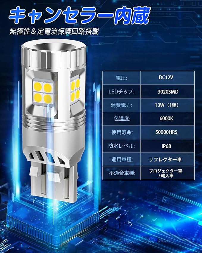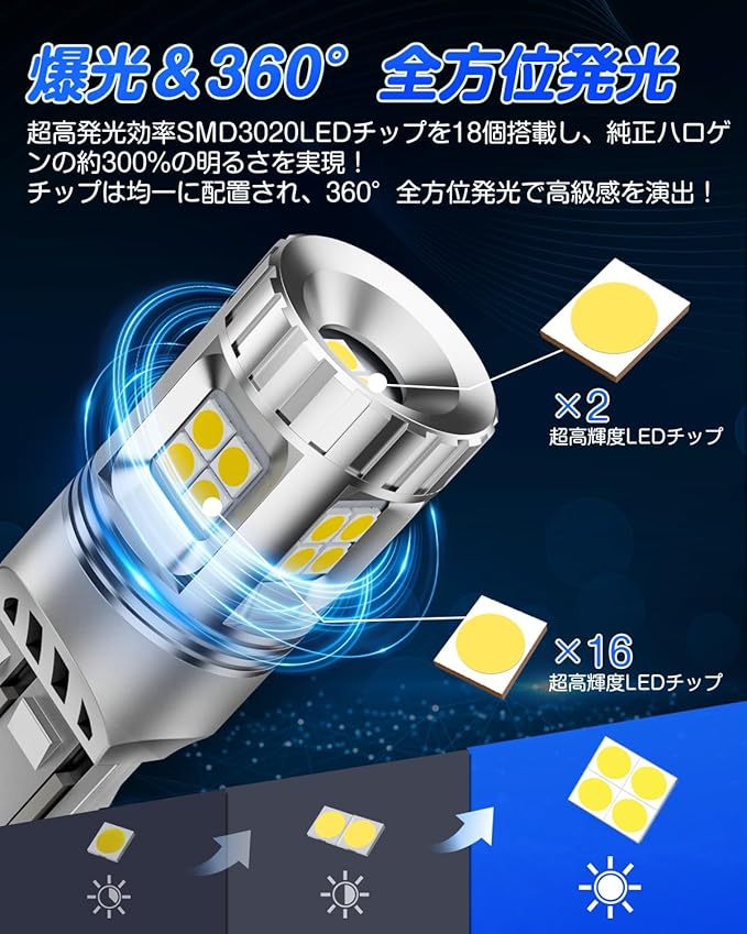【爆光LEDバルブ&360 全方向照明】SUPAREEのT20 LEDダブルは超高輝度の3020SMDLEDを18個搭載し、360 全方向に光を拡散させることで、均一な明るさを実現しています。超高輝度により、車両後方の照射範囲をより遠く・広くカバー可能。悪天候時でも視認性が高く、後方からの追突事故などを防ぎ、安全性を大幅に向上させます。※本製品は12V専用です
