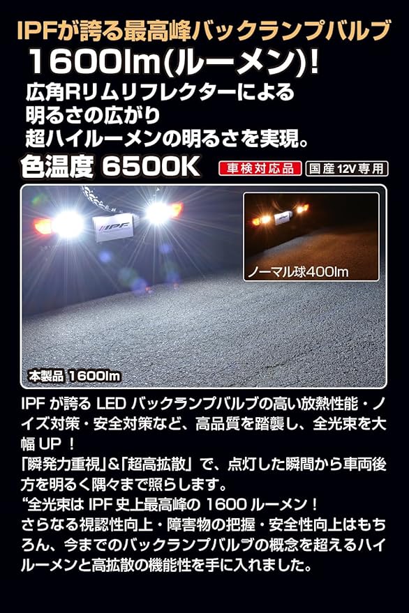 IPF バックランプ LED 車用 T20 1600lm 6500K ホワイト 12V用 1個入 車検対応 ノイズ対策済 最新ハイルーメンモデル 超高効率新型LED搭載 定電流回路+保護素子内蔵 701BL