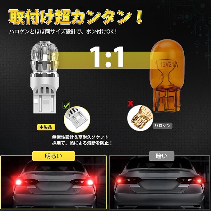 【ステルス仕様&優れた耐久性】高級LEDバルブをお探しですか?Perrace t20 led ダブル ブレーキランプは、高品質な銀色ボディと硬い保護カバーを採用し、LEDチップを外部の汚れや衝撃からしっかり守ります。LEDチップは外に露出せず、車両の美観を損なうことなく、より洗練された印象を与えます。さらに、99%透過率で、光がクリアで均一、360 全方向に豊かな光を提供し、高輝度と長寿命を実現!耐熱温度180℃を誇り、過酷な環境でも安定した性能を発揮し、長期間の使用にも耐える優れた耐久性を備えています。