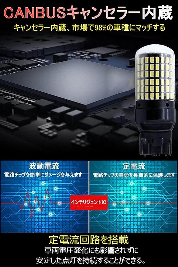 定電流回路 安定性抜群:このt20 led アンバー ホワイトはインテリジェント定電流回路を搭載。車両電圧変化にも影響されずに安定した点灯を持続します。これによりLEDにかかる負荷をおさえ、より長寿命を実現しております。