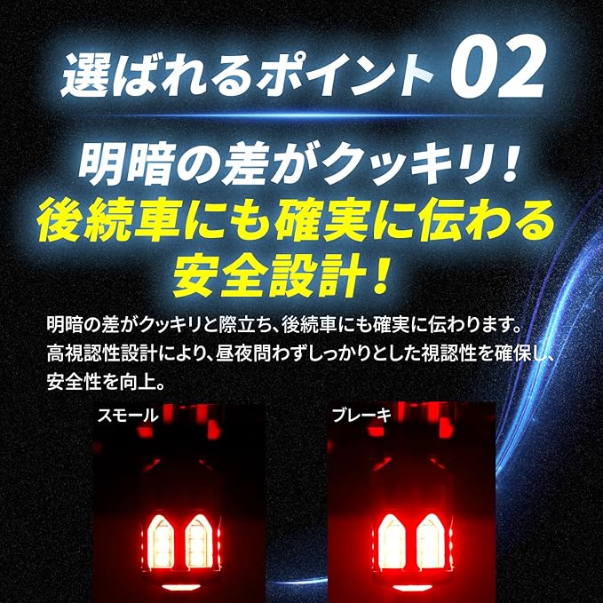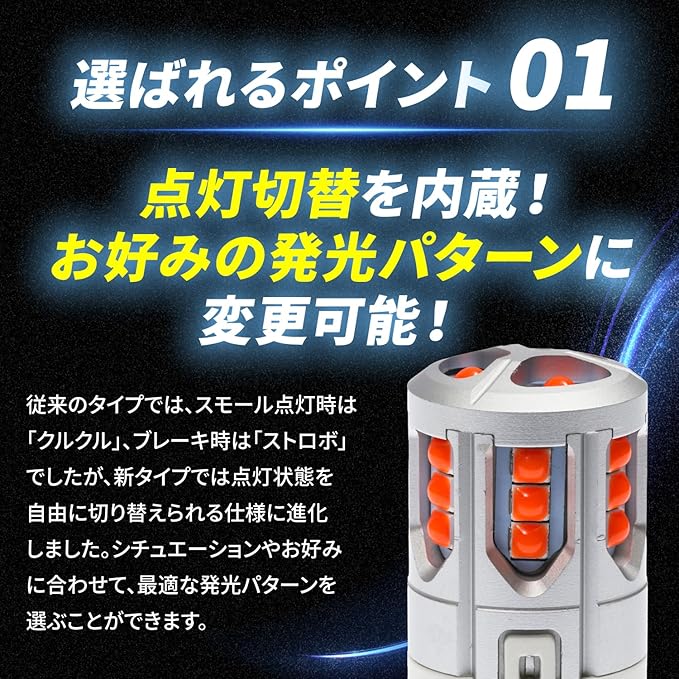 ✅【点灯切替を内蔵!お好みの発光パターンに変更可能】従来のタイプでは、スモール点灯時は「クルクル」、ブレーキ時は「ストロボ」でしたが、新タイプでは点灯状態を自由に切り替えられる仕様に進化しました。シチュエーションやお好みに合わせて、最適な発光パターンを選ぶことができます。 ✅【明暗の差がクッキリ!後続車にも確実に伝わる安全設計】 明暗の差がクッキリと際立ち、後続車にも確実に伝わります。高視認性設計により、昼夜問わずしっかりとした視認性を確保し、安全性を向上。 ✅【新たにT20ダブルを追加!多様なニーズに対応】 従来はS25ダブルのみの展開でしたが、新たにT20ダブルが登場!これにより、より多くの車種や用途に対応できるようになり、選択肢の幅がさらに広がりました。 ✅【注意事項】 ・切り替えはスモール点灯時のみ可能です。 スモールがオフの状態では切り替え操作ができません。 ・スモールオフ時は、ブレーキを踏むとストロボ状態になります。 スモールが消灯している場合、ブレーキ時の発光はストロボになります。 ・切り替え内蔵タイプは、通常タイプと動作が異なる場合があります。 仕様上、通常タイプと若干異なる動きをすることがありますので、ご了承ください。