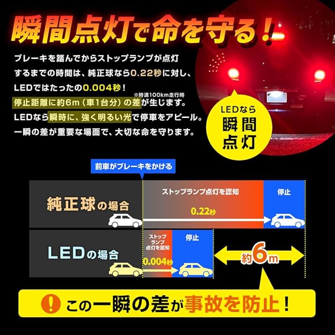 LEDと純正球ではブレーキを踏んでから一定の明るさになるまでに約0.21秒の差があります。