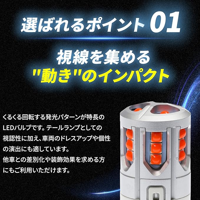 ✅【視線を集める"動き"のインパクト】 「くるくる回って面白い!」「後続車の注目度が上がった」 → 点滅だけではなく、“くるくる回る動き”という視覚的インパクトが非常に高く、目立ちやすい。 テールランプとしての安全性だけでなく、他車との差別化・装飾効果も高く評価されています。