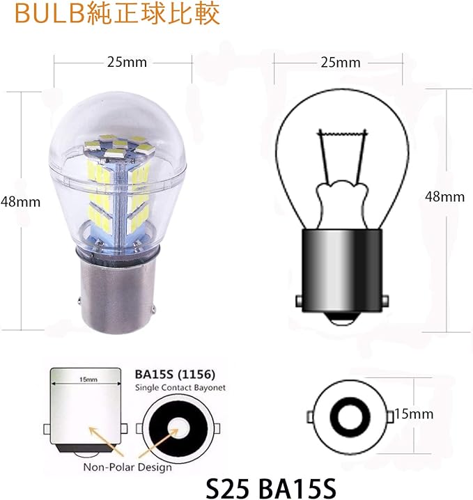 【 S25 LED シングル 】バックランプにおすすめ。シングル球、ピン角度180 ( BA15Sタイプ 12V21W対応)、ホワイト光、DC12V/24V対応可。