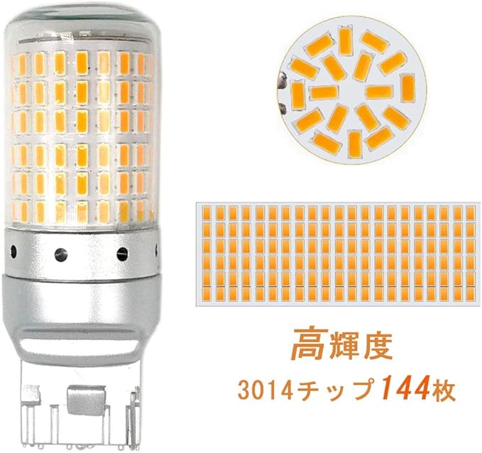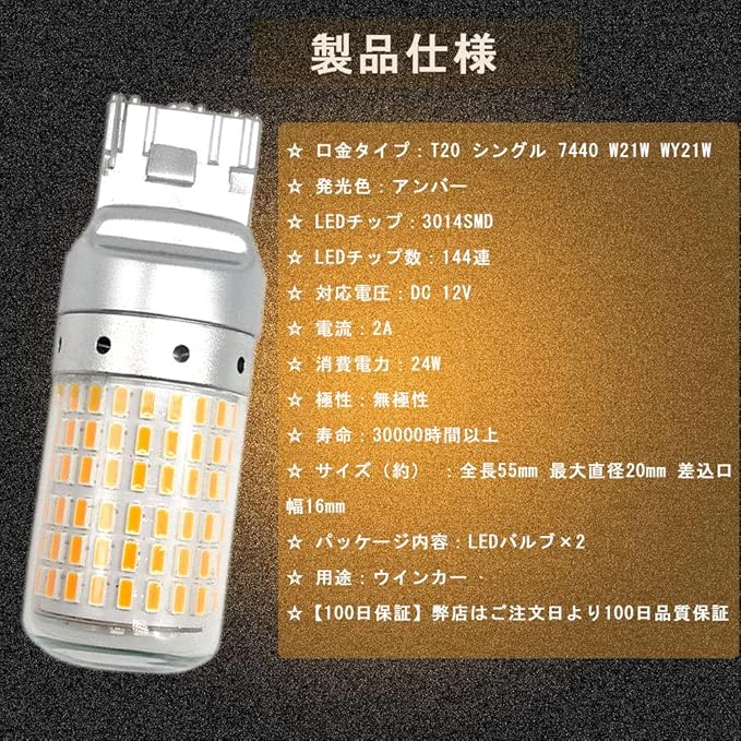 【製品仕様】ソケット:T20 シングル 7440 W21W WY21W ピンチ部違い対応 / 発光色:アンバー / LEDチップ:3014SMD / LEDチップ数:144連 / 入力電圧:DC 12V / 電流:1.75A / 消費電力:21W / 極性:無極性 / サイズ(約) :全長55mm 最大直径20mm 差込口幅16mm / パッケージ内容:LEDバルブ 4、100日保証