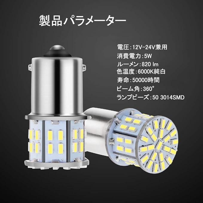 形状:S25 シングル球 ピン角180度 発光色:ホワイト 6000K-6500k 対応電圧:DC12V-24V 商品内容:バルブ2個 極性:無極性