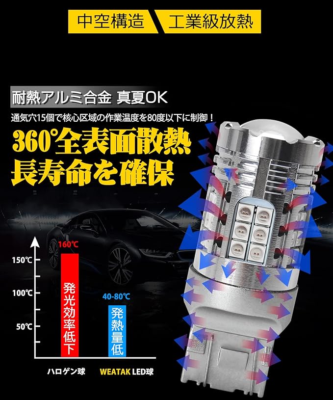 【ブレーキランプ最適の高輝度】後続車へのアピールできため超拡散レンズ付き、ムラのない全方位照射。純正より280%の明るさ、昼でもフォグや雨の日でも高い視認性がある。97%以上超高発光効率、同等の明るさの上でハロゲン球より55%省エネ。
