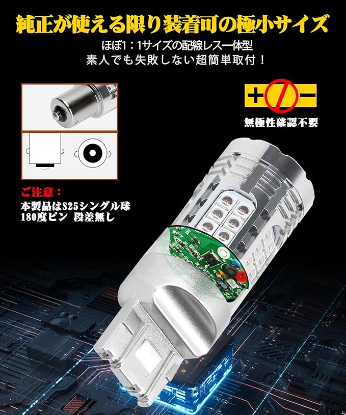 【ポン付け】配線加工一切不要。無極性、差し込むだけで完了。サイズは純正T20バルブとほぼ同じで、純正が使える限り装着可能。【正規メーカーより安心の1年保証※日本語サービス対応】LED化を初めてのお客様にも安心していただけるよう、ご購入日から1年間に理由なく不点灯する場合など、「48時間以内の全額返金や全新品交換」を約束いたします。工場では、全ての商品に20min連続点灯テストを実施しながら発送しおりますが、万が一初期不良等における不具合は、ご連絡を頂けると24時間以内に優しく対応致します。