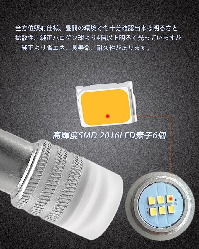 【360 全方位照射でき】2016SMD LED素子6連搭載。上部は5連、周りは27連、レンズ付きで光線を集中でき、照射距離を増やせる、本気の360 全方位照射でき。