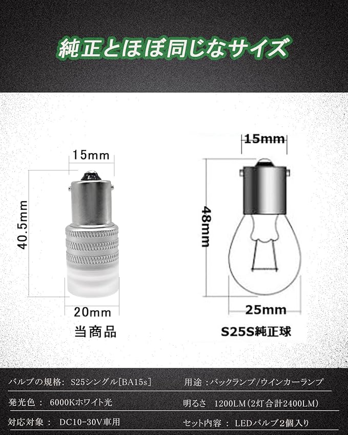 【 S25 LED シングル 】バックランプにおすすめ。シングル球、ピン角度180 ( BA15Sタイプ 12V21W対応)、ホワイト光、DC12V/24V対応可。