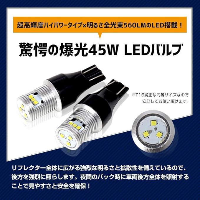 ✅ 超爆光45W・560LMで後方視認性アップ:超高輝度SMD LEDを9基(側面6+先端3)搭載。純正球を大きく上回る明るさで、夜間や暗所でのバック時も安心感を高めます。