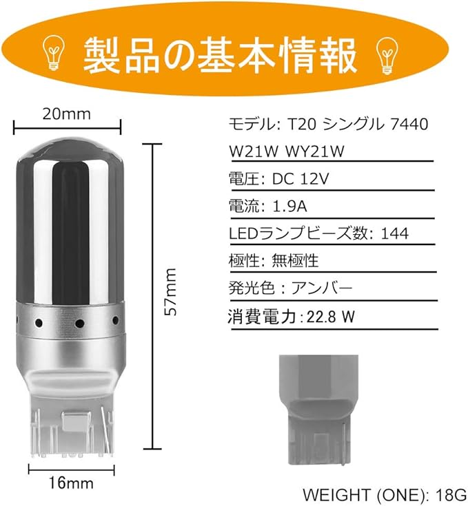 【商品 スペック】発光色:アンバー / LEDチップ:3014SMD / LEDチップ数:144連 / 入力電圧:DC 12V / 電流:1.A / 消費電力:22.8W / 極性:無極性 / サイズ(約):全長57mm 最大直径20mm 差込口幅16mm / パッケージ内容:LEDバルブ 4。