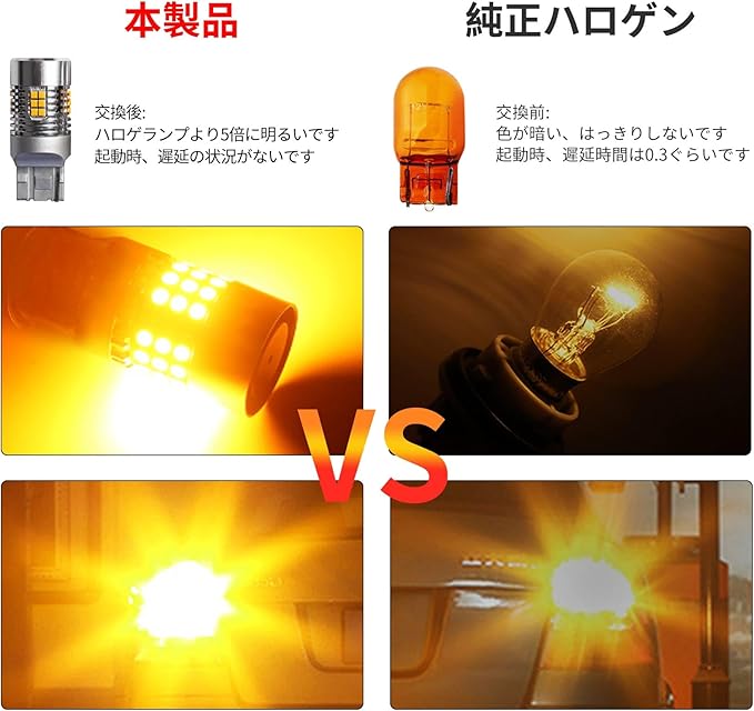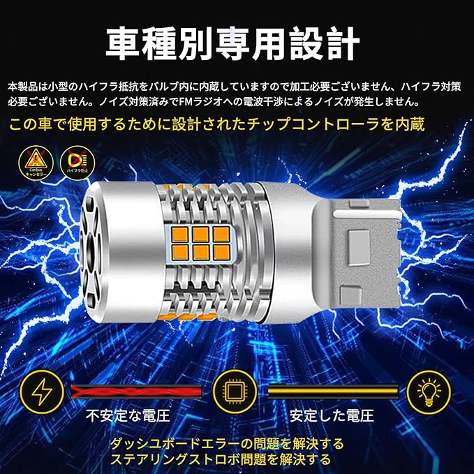 専用ハイフラッシュ防止抵抗器内蔵・取付簡単:従来のLEDウインカーをハロゲンバルブからLEDに交換すると、パワーの差によりウインカーが高速点滅するハイフラッシュ現象が発生します。 。 従来は配線と抵抗器の取り付けが別途必要でしたが、本製品はバルブ自体に高いフラッシュプロテクションを内蔵しています。 抵抗器の取り付けや面倒な配線加工の必要がなく、電球を交換するだけで取り付けが完了し、専門的な知識は不要です。 ★ ダッシュボードのエラー問題を解決します。 ★ ステアリングのちらつき問題を解決します。
