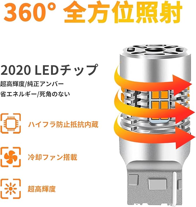 リアLEDウインカー:バルブ全面に2020年製高性能ウインカー専用LEDチップを36個搭載し、360度十分な発光を実現します。 この明るさにより、車両後方をより遠くまで広範囲に照らすことができ、安全性が大幅に向上します。 昼間の環境下でも目に見える明るさと拡散性、純正ハロゲンバルブよりも明るく省エネ、明るさが約4倍と大幅にアップします。 夜間の視認性を向上させ、運転の安全性を確保します。