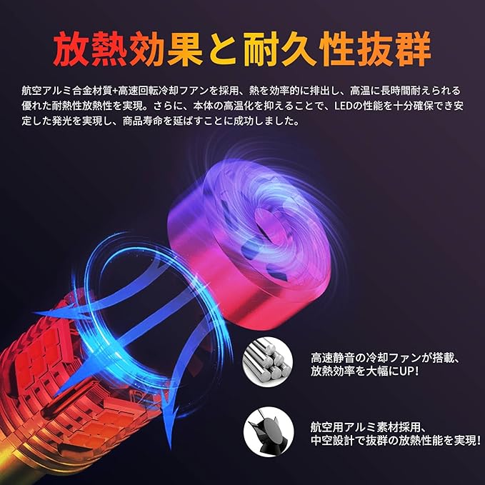 航空アルミニウム合金素材+高速回転冷却ファンを採用し、効率的な放熱を実現します。 耐熱性、放熱性に優れ、高温にも長時間耐えられます。 また、本体の温度上昇を抑えることで、 LEDの性能を十分に確保し、安定した発光と長寿命化を実現しました。