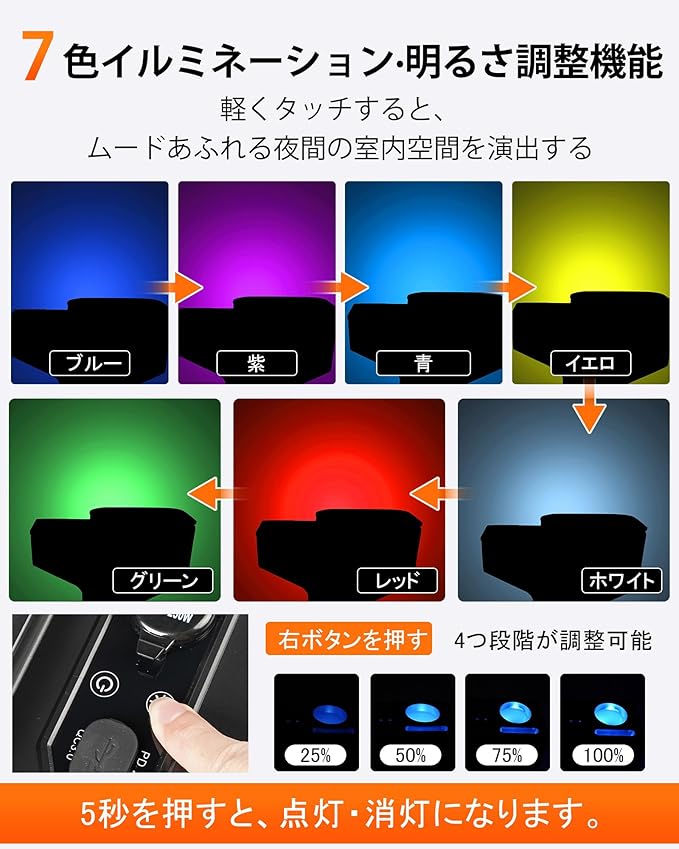 【前席も後席も楽しめる7色led照明】様々なシーンに応じて、段階(100%・75%・50%・25%)の明るさ設定できます。ワンタッチでライトカラーを自由に切り替え、自動変色モードも搭載し、車内雰囲気をお好みでカスタマイズできます。後部座席専用のスイッチを増設し、乗る人全員で便利と思える多機能コンソールです。