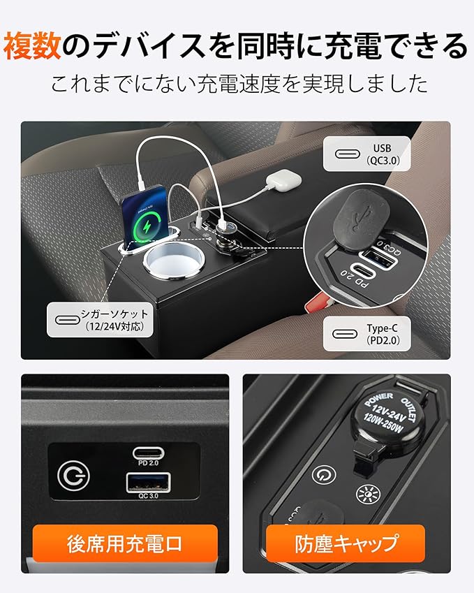 【充電設備を完備】コンソールの上にはシガーソケット*1、Type-Cポート*1、QC3.0 USBポート*1を設置。後部座席にもType-CポートとUSBポートを1つずつ設置。ドライブ中の充電設備不足、もう心配いらず。注意:出力定格を超えて使用しないでください。