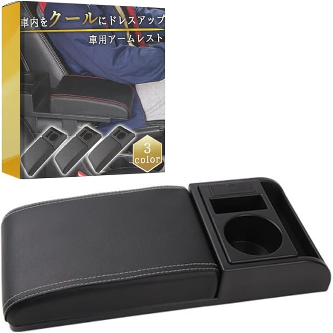 ①ドライブを快適にする車用汎用アームレスト。 ドリンクホルダーとUSB充電ポート付きで、インテリアをオシャレにカスタム。 コンソールボックスに簡単装着可能。