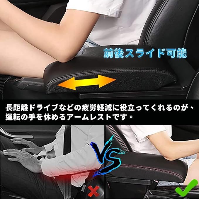 【デザイン性アップ】運転席からすぐにアクセスできる収納スペースとして使えるだけでなく、車に最適な機能を付加することができます。肘おきクッションが前に5CMまで動き、肘を置きやすい位置に調整できます。長距離ドライブなどの疲労軽減に役立ってくれるのが、運転の手を休めるアームレストです。