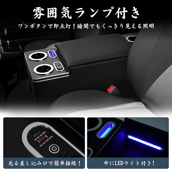 4.【利便性と収納力の融合】:車のキーやスマホ、タバコ、財布、手帳、カード類など、運転中に必要な小物をまとめて収納可能。大容量のアームレストボックスで車内をすっきり整理でき、専用ドリンクホルダーとスマホホルダーも装備しているため、快適でストレスのないドライブ空間を実現します。