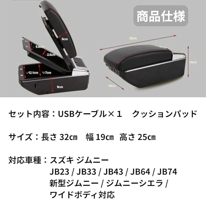 ◆【商品仕様・対応車種】 セット内容:USBケーブル 1 クッションパッド サイズ:サイズ:長さ 32㎝ 幅 19㎝ 高さ 25㎝ 対応車種:スズキ ジムニー JB23 / JB33 / JB43 / JB64 / JB74、新型ジムニー、ジムニーシエラ、ワイドボディ対応。 ※車載充電器・電池は付属しておりません