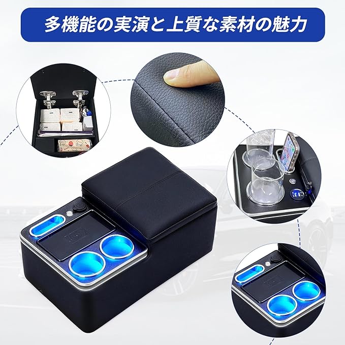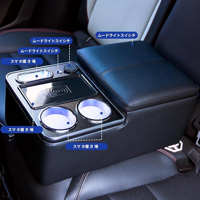 【夜のドライブに快適さを】上面プレートにはLED照明を内蔵。暗闇でも荷物の位置が一目でわかり、コンソールからの出し入れも簡単です。