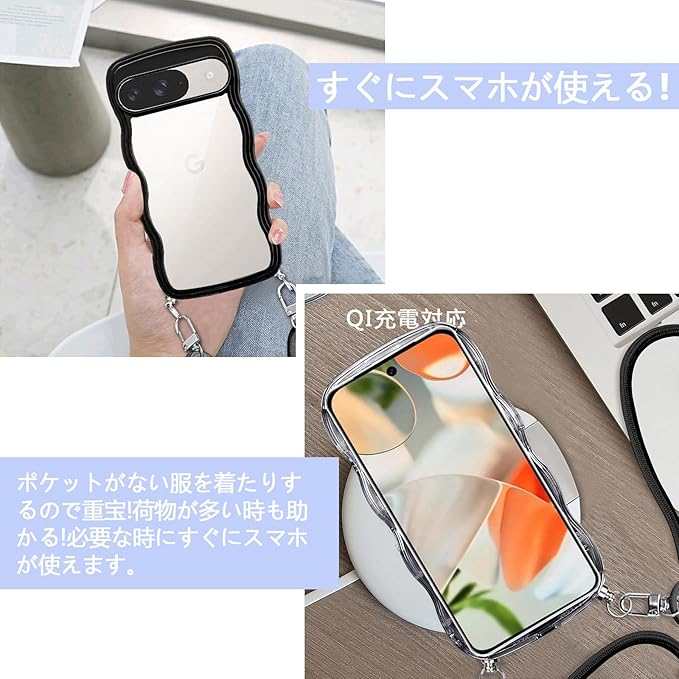 Google Pixel10 用の ケース pixel 10 Pro ケース クリア ショルダー グーグル ピクセル10/10pro スマホケース カバー 透明 TPU ストラップ付き 肩掛け 首掛け 紐付き 斜めがけ 創意 個性 可愛い かわいい 韓国 耐衝撃(ブラック)