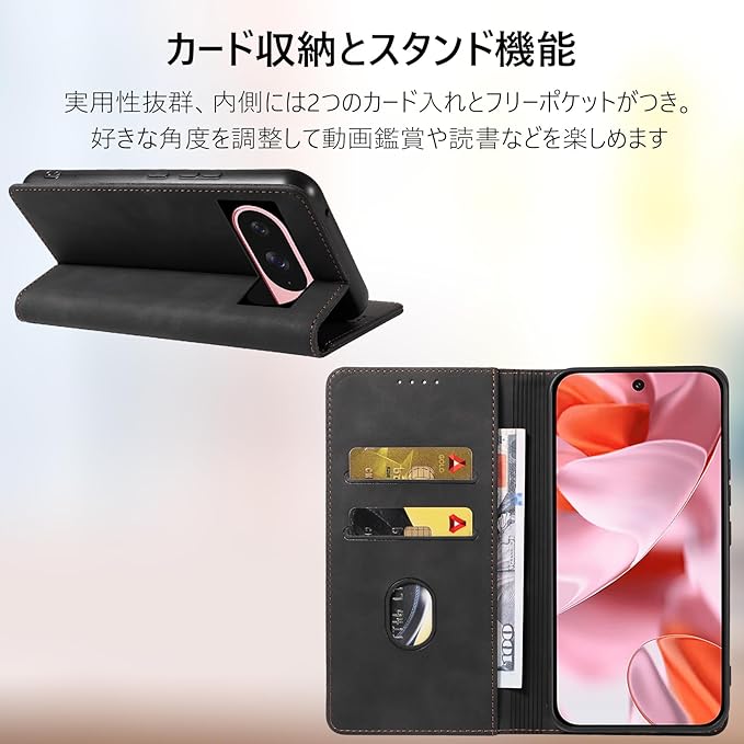 【カード収納とスタンド機能】google pixel 10Pro 用カバー動画視聴に便利なスタンド機能が付き、横向いて斜めに立てて、お好きな角度を調整でき、両手が解放され、お気軽に読書やビデオの観賞を楽しむことができます。内側には2つのカード入れとフリーポケットがつき、名刺や定期券の収納に優れているピクセル9Pro カバーです。