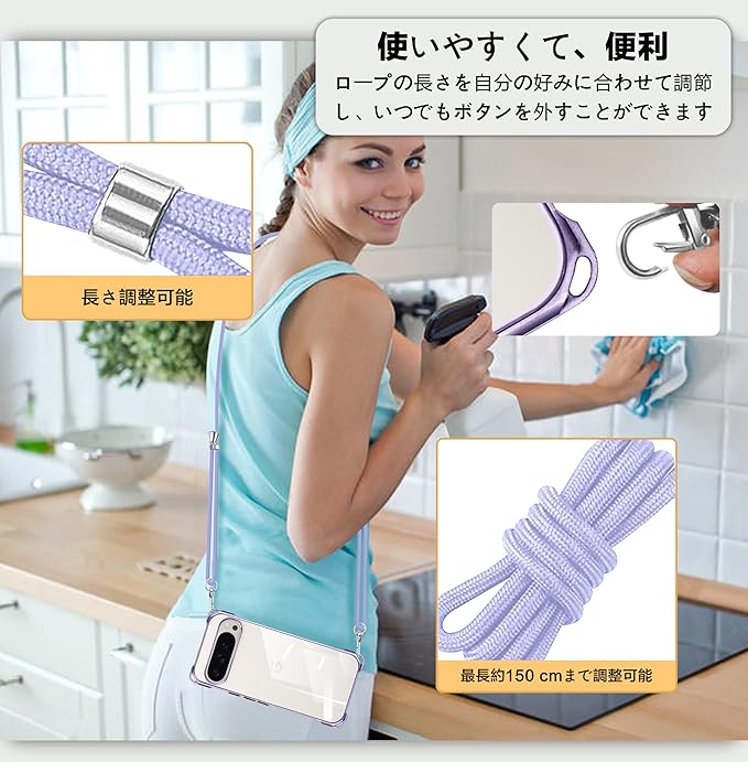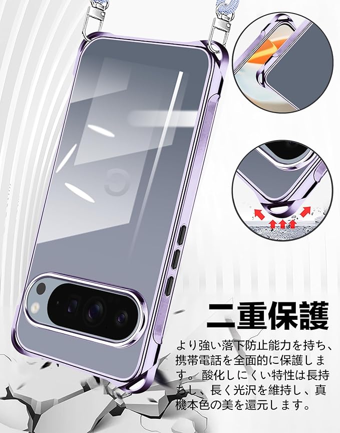 For Google Pixel 10 Pro XL 用 ケース クリア ショルダー 10Pro XL 携帯カバー 耐衝撃 全面保護 スマホケース ストラップ付き 肩掛け 斜めかけ 縄掛けケース TPU 薄型 軽量 取り外し可能 落下防止 柔軟【パープル】
