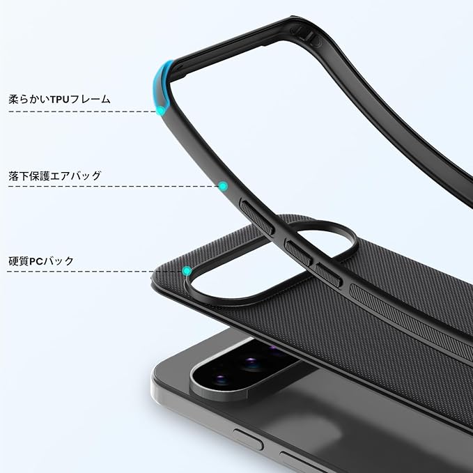 【二重保護・エアクッション構造】柔軟なTPUフレームと硬質PC背面パネルの二重構造でしっかり保護。四隅には衝撃を吸収するエアクッションを搭載し、落下時のダメージを効果的に軽減します。